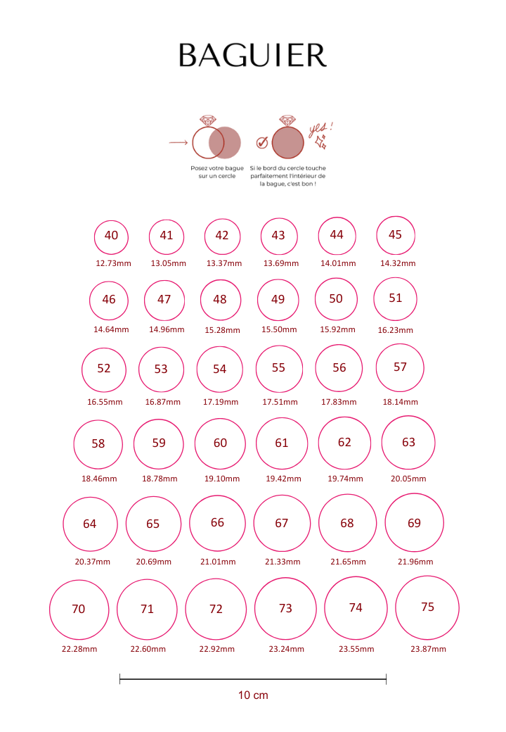 Si vous hésitez sur la taille, vous pouvez utiliser un guide de mesure fournis ou demander la mesure en bijouterie pour éviter tout échange.
